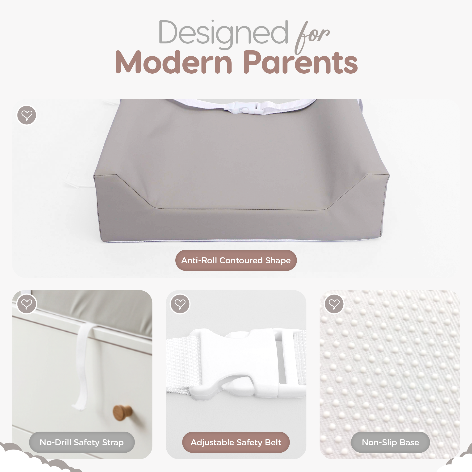 - Unique Design - Featuring three raised sides, this changing pad stands apart from anything else in the market. The innovative contour offers unmatched protection to prevent your baby from falling or bumping their head during change times. The addition of a safety strap and simple wall mounting system eliminates the need for drilling and ensures secure attachment with the aid of adhesive and hook and loop fastening.