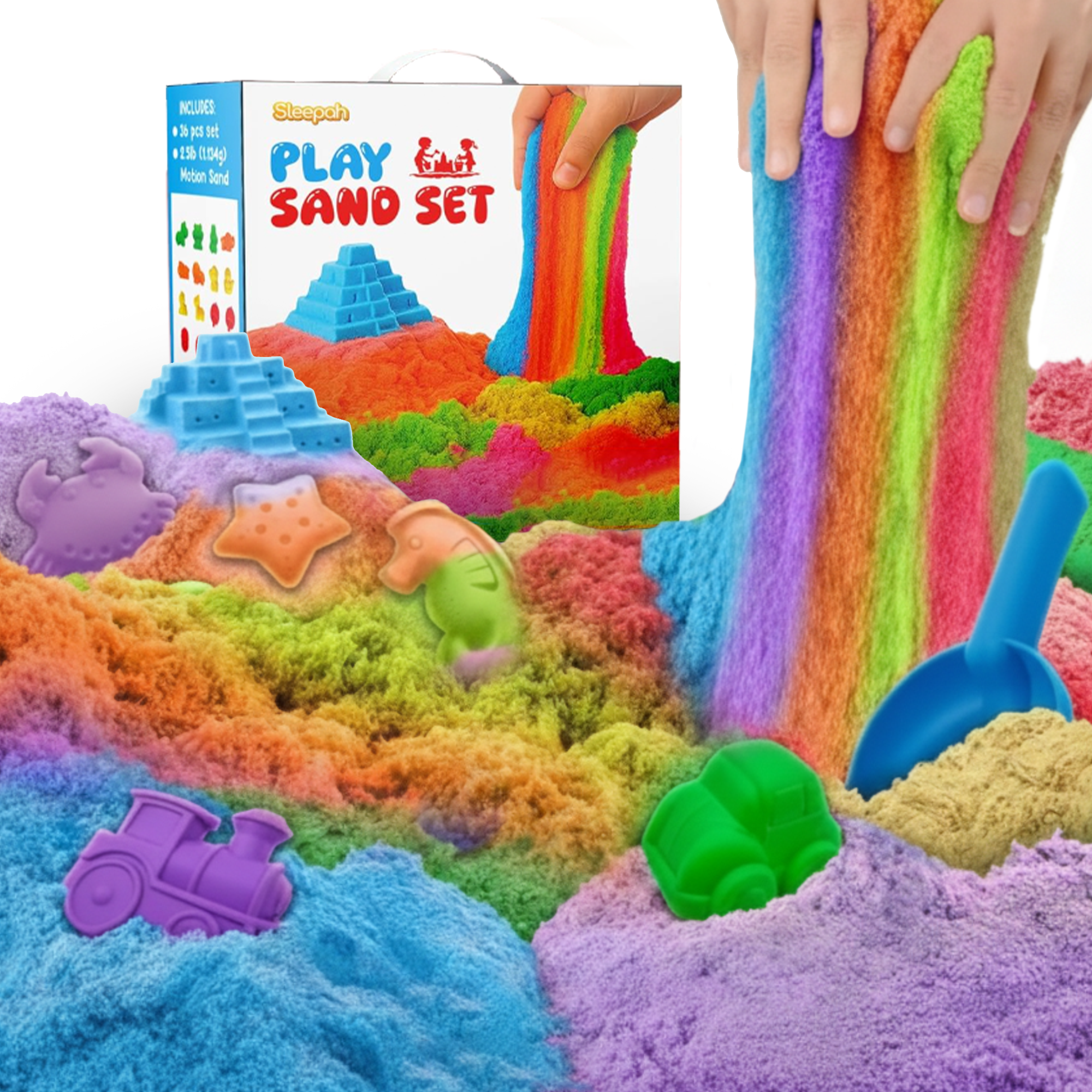 - SLEEPAH Creative Molding Fun - Dig into 5 lbs of vibrant, multi-colored sand that sticks together for imaginative molding. Comes with 13 beach and castle molds, this set inspires artistic cityscapes and historical tales, all while ensuring a neat playtime.